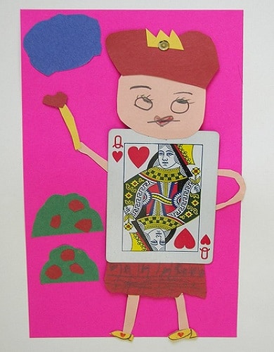 Alice au Pays des merveilles : collez simplement une carte au centre d’une feuille de papier et créez un décors autour de la carte sur le thème d’Alice au Pays des merveilles. Vous pouvez en faire des petits personnages en ajoutant une tête, des bras et des jambes avec du papier (peinture ou feutres).